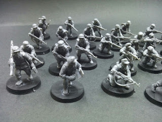-Obviamente, la variedad de los uniformes. En esta caja la mayoría de las miniaturas no van con el uniforme clásico de la Werhmacht, si no que muchas llevan los camuflajes M44 y ponchos , lo que hace que la estética sea muy diferente con el resto de miniaturas de la gama de Warlord.