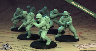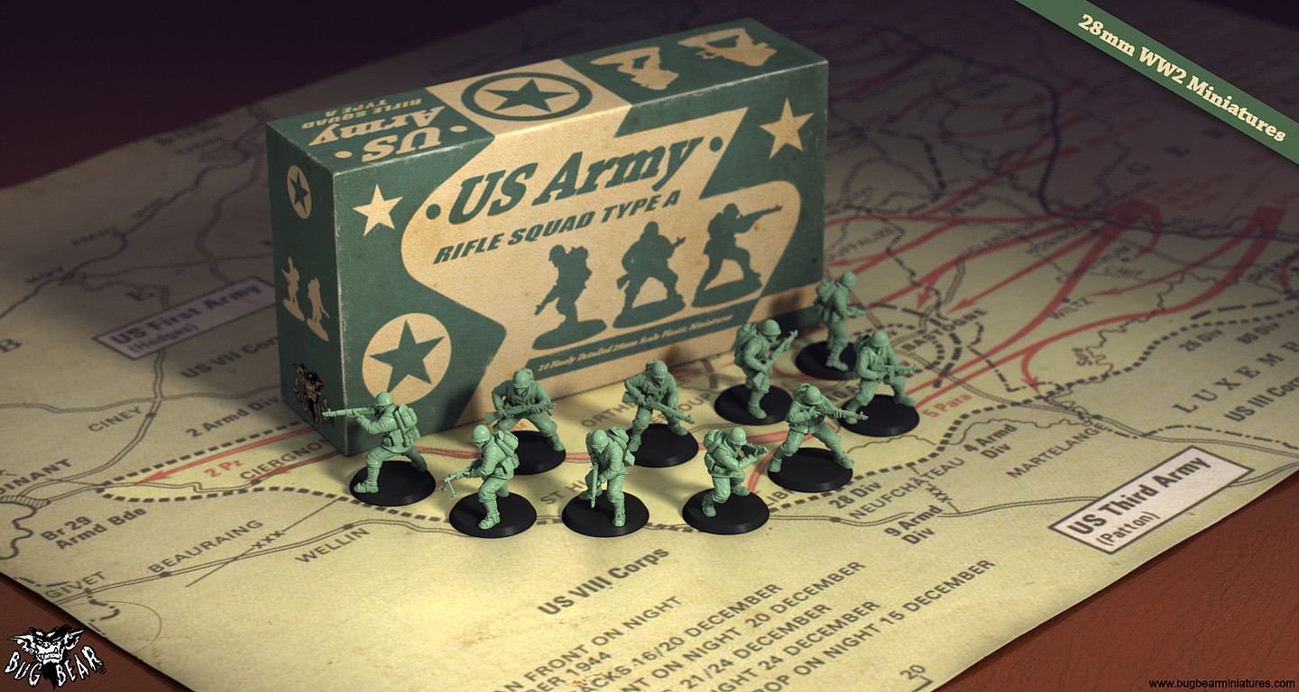 El otro día me llego un enlace de Beast of war acerca de una nueva marca de miniaturas «Bug Bear miniatures» que tiene en mente sacar una gama de infanterías en resina (y próximamente en plástico) de distintos ejércitos, y cuyo primer lanzamiento será una caja de escuadra de fusileros americanos.