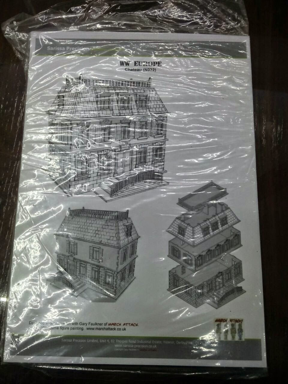 El chateau viene en una pequeña bolsa de plástico, con un par de folios de instrucciones, y a simple vista mucho mas fácil de montar que el Stone Hotel de 4ground, aunque viene sin pintar. Aquí tenéis las fotos del contenido del sobre.