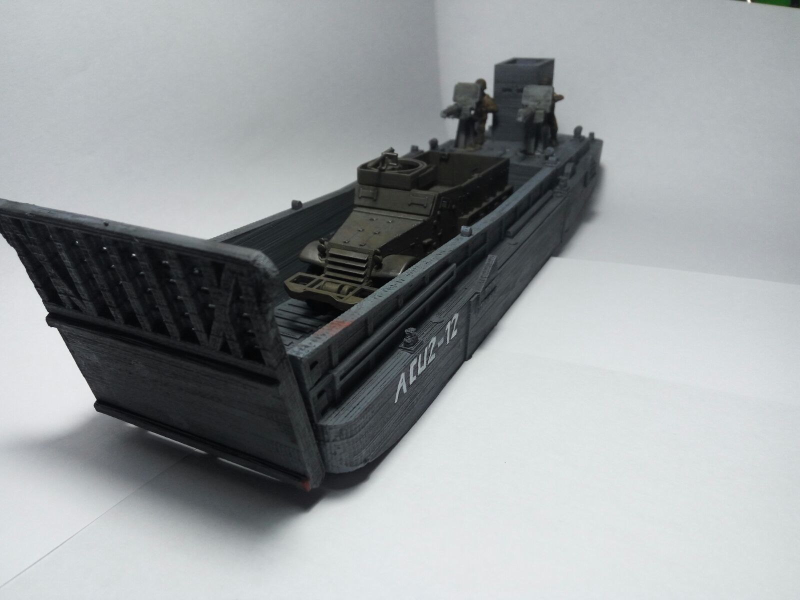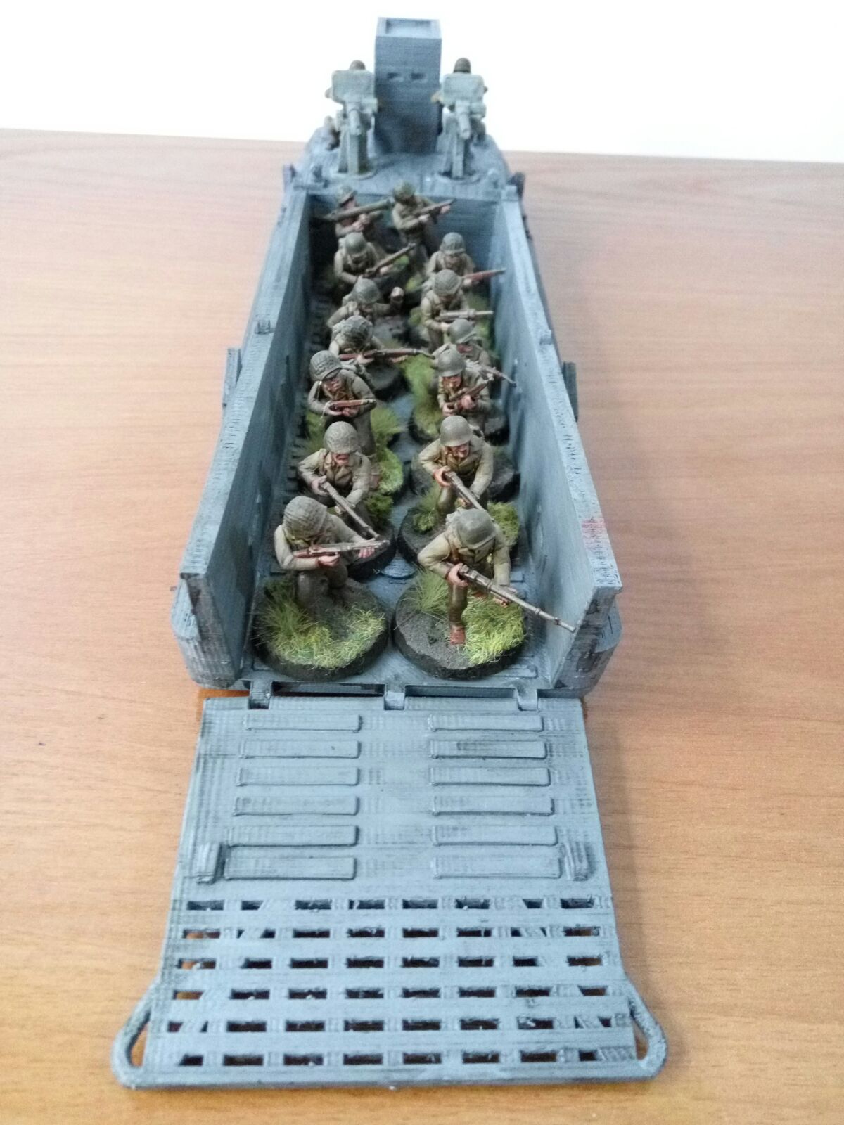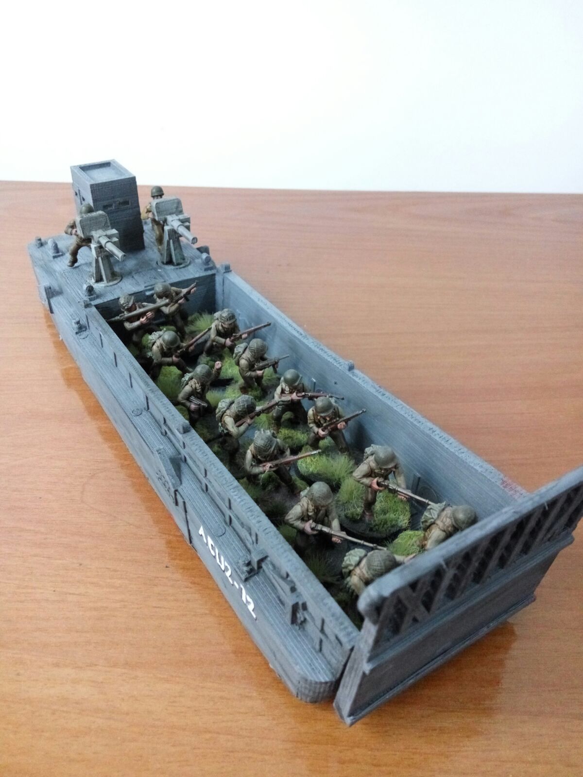 El primer problema que suponen estas lanchas de desembarco tan grandes, es que no caben en la impresora 3D, así que tuve que partirla en dos partes para poder imprimirla, y luego pegarlas entre sí. Otro de los problemas es la tripulación, pues parecen muñecos de LEGO más que otra cosa, así que hubo que sustituirlos por dos infantes americanos a los que cambiamos la posición de los brazos para que parecieran sostener las ametralladoras.