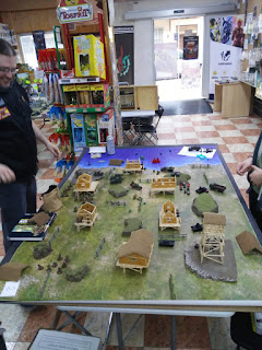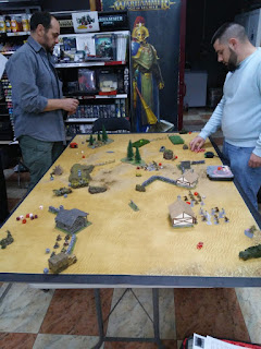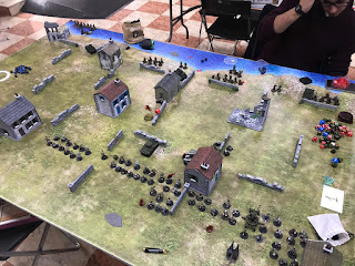 Escenario 7. Envolvimiento. Mi oponente, que había sido instruido en las artes oscuras por mi mismo unos días antes, me hace caso y escoge ser el defensor en este escenario. Me despliega en mesa todo menos un camión con MMG, el cual lleva una escuadra de infantería. Yo no dejo nada en reserva a sabiendas que el tiempo es mi segundo mayor problema en este tipo de partida. Tras un primer y segundo turno nefasto donde mis TACAM no consiguieron impactar a 4+ a un Panzer I, y mis ingenieros fallaron también a 4+ con un panzerfaust y lanzallamas, mi oponente logra volarme un TACAM con un PanzerJager I, me ametralla un bofors hasta matar todos los tripulantes y me borra del mapa dos escuadras de ingenieros, una con el Panzer I (tambien como King Tiger II), y la otra con el Panzer I del otro flanco. Por contra, no tiene suficientes balas para impedir que me acerque demasiado con las otras dos escuadras de ingenieros, que empiezan a calcinar a las escuadras de infantería del DAK, así como a los Panzer I que estaban campando a sus anchas por allí. En la zona central del tablero, un comisario y un oficial se dedican a suprimir a las escuadras de infantería y dar fuego de cobertura a los ingenieros que siguen avanzando hacia la zona de despliegue del enemigo, que se ve saturado por la cantidad de miniaturas que hay en mesa. Finalmente y a pesar de las perdidas sufridas, logro sacar un TACAM R-2, unos ingenieros, un camión y una escuadra de fusileros por el borde de la mesa del oponente. También logro hacerme con el objetivo central (el cual de un punto de victoria en todas las partidas del torneo). Resultado EMPATE, pero con el objetivo central rasco 2 puntos para la clasificación general.