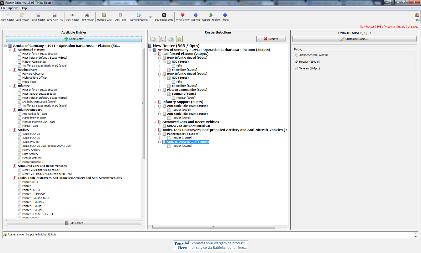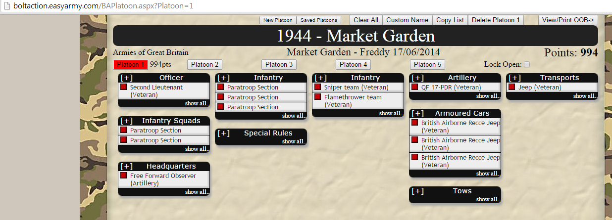 Una de las aplicaciones mas completas y famosas para hacer listas de ejercito. Disponible tanto para PC como para Android, podrás hacer las listas en un dispositivo y exportarlas rapidamente al otro a través de las funciones del mismo programa. Como punto a favor es gratuito (aunque con publicidad), y como puntos en contra, las listas actuales no incluyen personajes especiales, ni reglas de la web de Warlordgames, ni están los distintos suplementos ni los pelotones acorazados ni aerotransportados, ademas, no permite mezclar pelotones reforzados de distintos teatros entre si. Una pena, ya que para otros juegos si que esta muy actualizado.