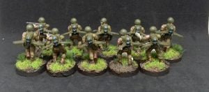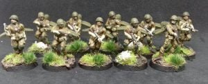 Hoy voy a mostraros una escuadra de Infantería de salto Firefly del ejército norteamericano para Konflikt 47. En términos de juego, esta escuadra está pensada para realizar asaltos, o para aparecer en lugares inesperados gracias a su habilidad «Vuelo», que le permite ignorar terreno (aunque han de terminar el movimiento sobre terreno despejado), y moverse hasta 12″ con un avanzar y 18″ con una orden de correr. En defensa puede cubrir huecos que se hayan podido producir durante la partida, y acudir rápidamente a donde más se les necesite. Además, su armamento base son SMGs, pudiendo ampliarse con BAR y lanzallamas. Eso si, a 18 puntazos por cada infante.