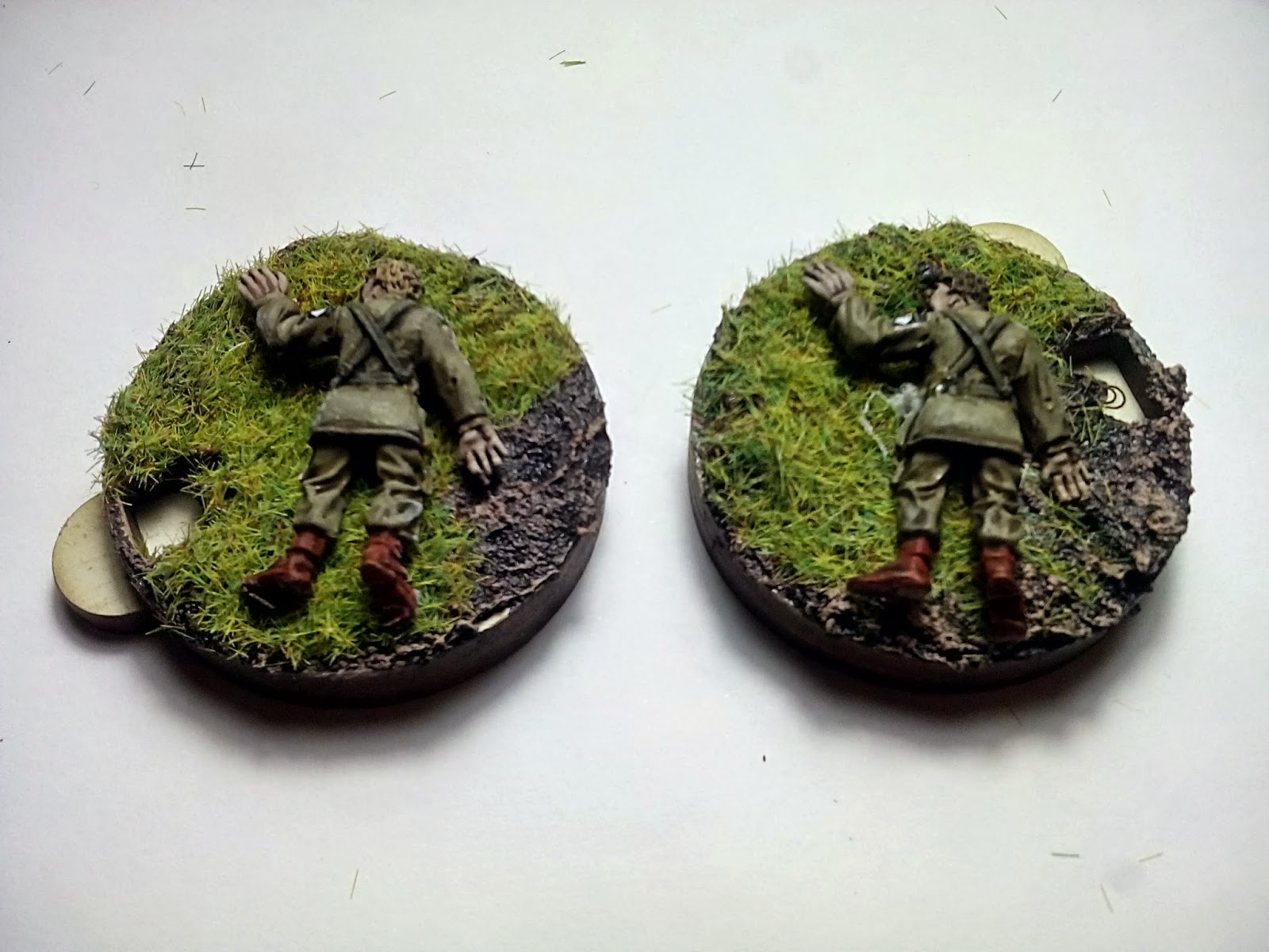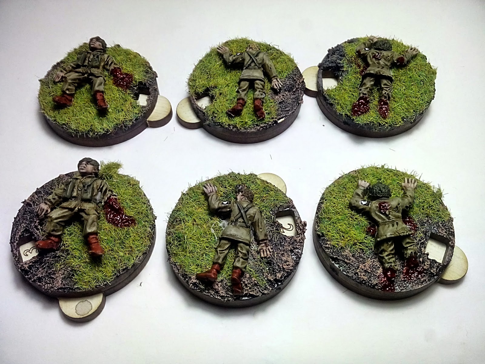Las miniaturas en cuestión son WW2078 U.S. Para Casualties (5 random) de Black Tree Designs, colocadas sobre unos contadores giratorios de madera de 4Ground. El pintado fue sencillo, siguiendo el mismo esquema de colores que mi ejercito y apoyándome en la guía de pintura de Artizan. La sangre es Blood for the blood god de Citadel.