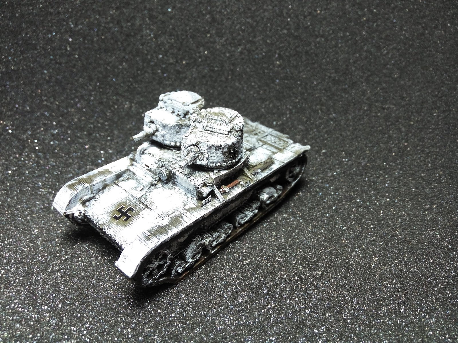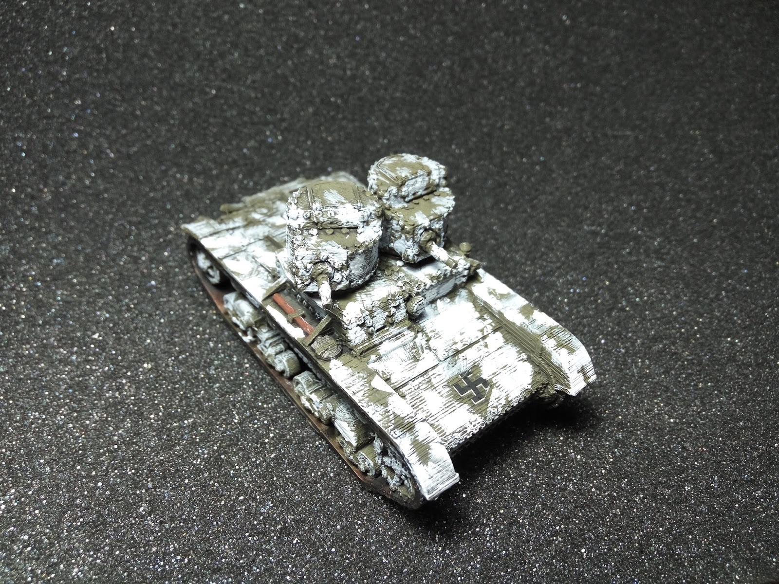 El pintado ha sido divertido, pues no es el clásico pintado uniforme con barro colocado a posteriori para darle sensación de suciedad al carro, pues he querido imitar el tanque que aparece en la cabecera de esta entrada, pintado con prisas e intentando ahorrar pintura blanca, que escaseaba en Finlandia por aquellos tiempos. No ha quedado como esperaba, pero me gusta bastante el resultado. La ausencia de barro y suciedad es intencionada, pues la nieve se encargaría de limpiar tanto lo uno como lo otro.