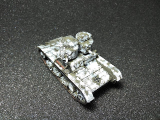 Para ello, primeramente imprimé los tanques con spray de tanques sovieticos de The plastic soldier company, seguido de detalles como las cadenas con Tin Bitz de GW (lo use con los Renault FT y me quede enamorado de ese color para las cadenas). Tras aplicar las calcas y el correspondiente baño de Nuln Oil de Citadel, procedí al pintado del blanco. Para ello utilice dos técnicas distintas, una por tanque.