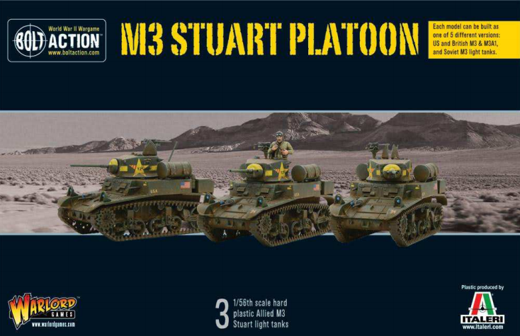 Warlordgames pondrá a la venta el día 8 de Octubre un nuevo set de plástico para el M3 Stuart. La caja en cuestión traerá los componentes necesarios para montar 3 Stuarts en distintas variantes (M3, M3A1 (también en sus versiones ingleses de reconocimiento, y la versión soviética).