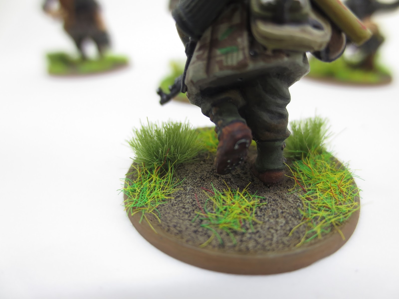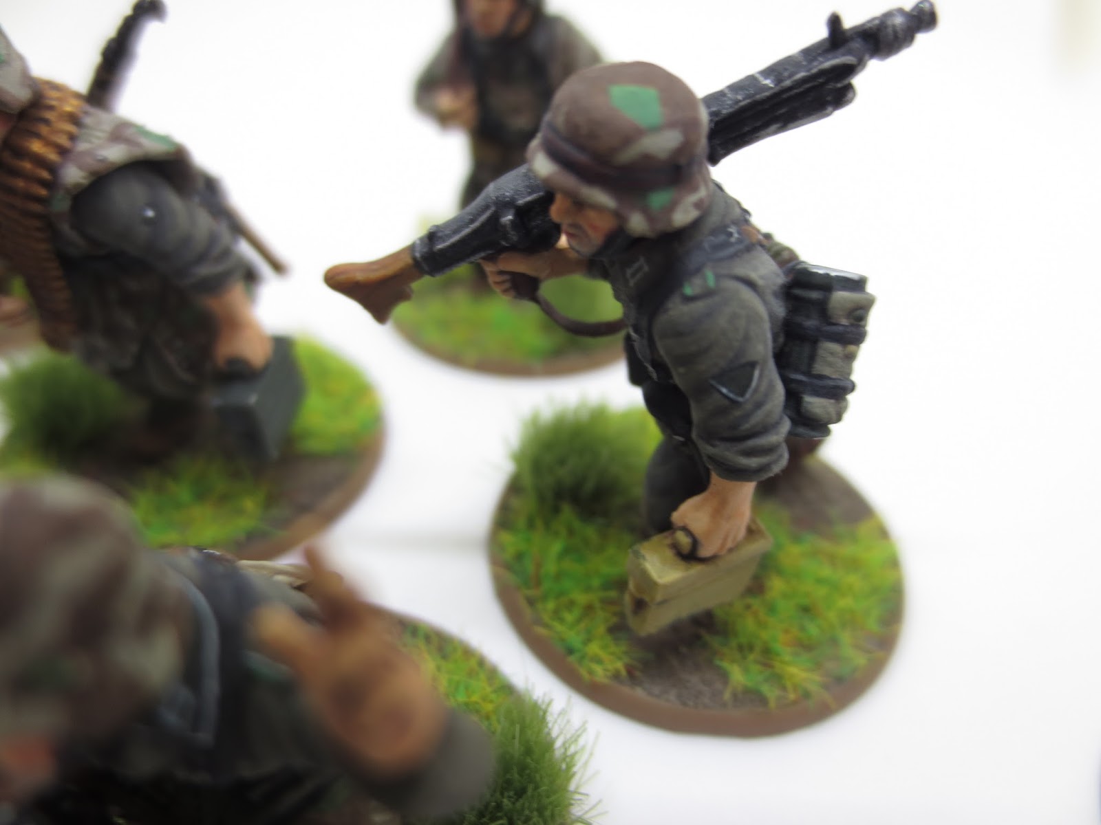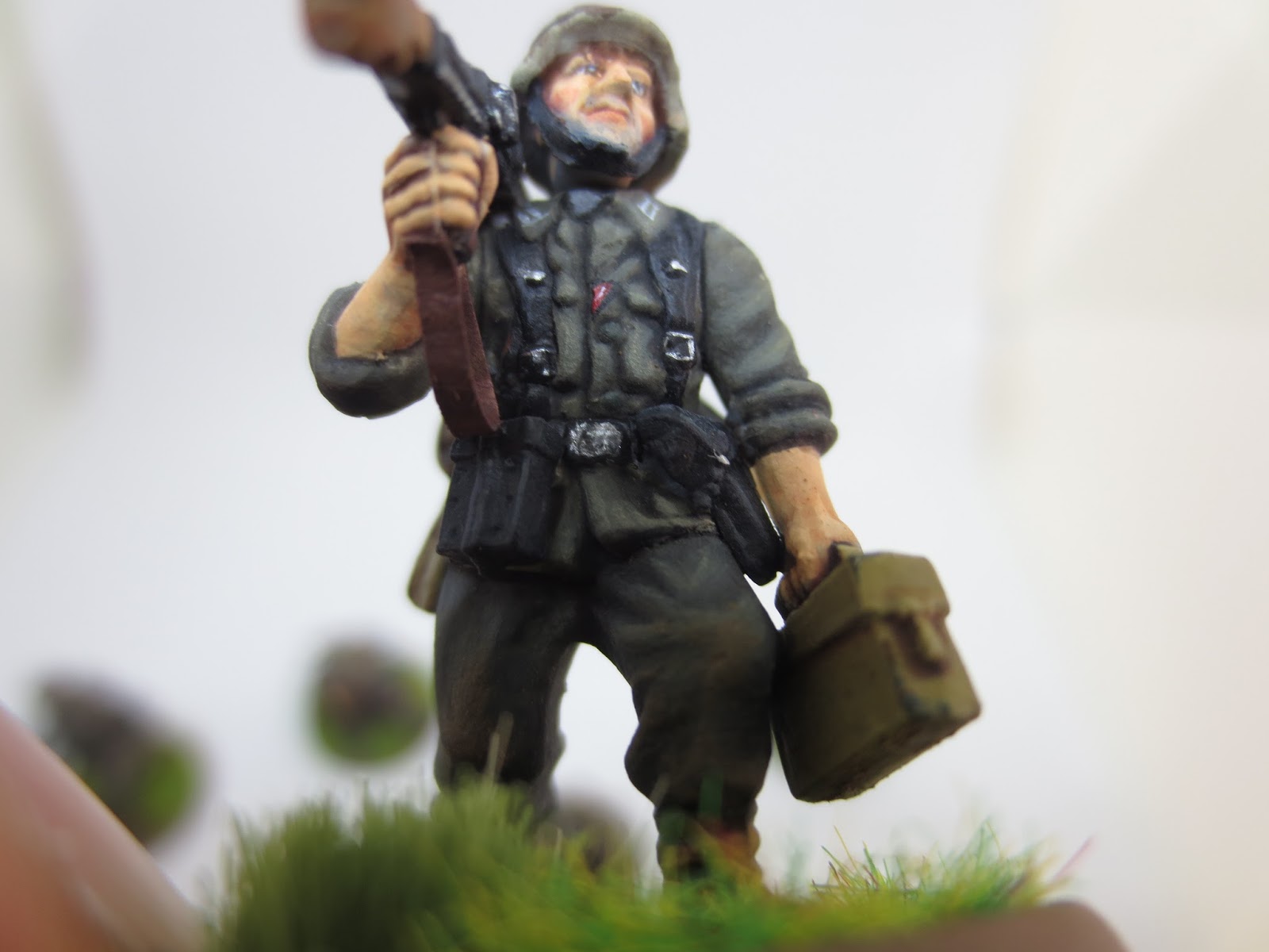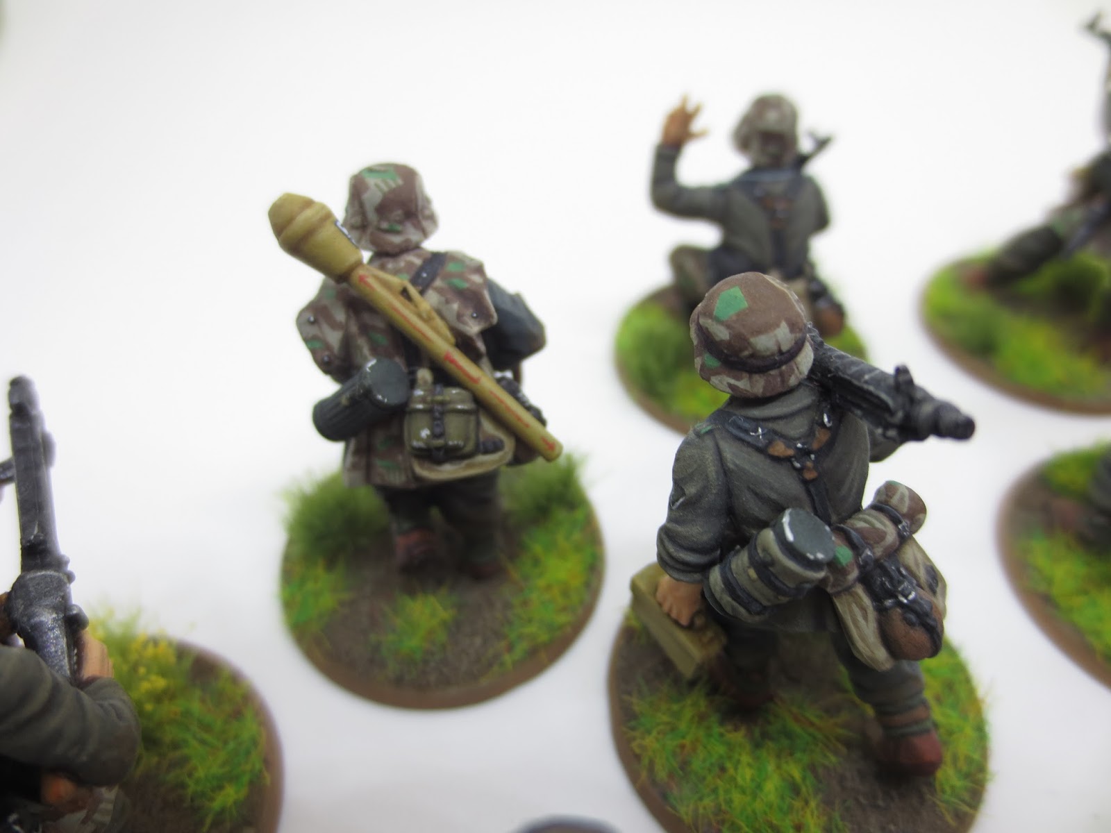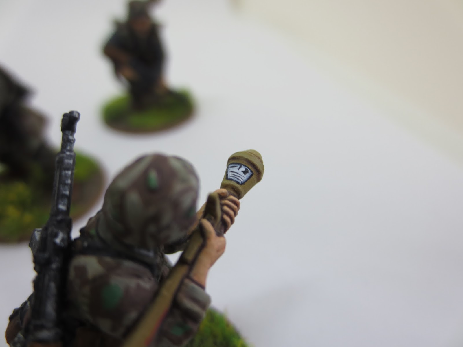 Pinté todas las insignias, condecoraciones, parches de rango y etiquetas de panzerfaust. A mí me gusta hacerlo a mano, pero tanto Warlord como CompanyB, ofrecen calcas para miniaturas de la SGM en 28mm.