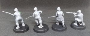 El montaje en sí no requiere muchas complicaciones, salvo que los brazos de las armas están pensados para los torsos de las matrices japonesas, los cuales son más estrechos que los alemanes, así que toca lijar un poco y aplicar masilla para rellenar los huecos. Para hacer el NCO, como de costumbre en mi ejército japonés, le puse una gorra y la katana colgando del cinturón. Para el cargador de la LMG destacase sobre el resto usé el torso FJ que está de rodillas en la matriz, además tuve que recortar dos cargadores de sendas LMGs de la matriz japonesa, además de los cargadores extra en el cinturón.
